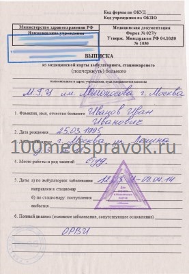 Купить медицинскую справку о болезни формы 027/у (выписка из истории болезни) с доставкой в любой город